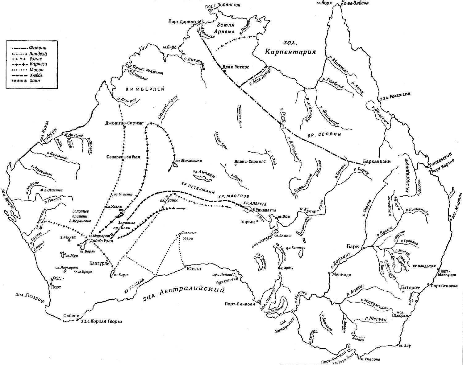 В 1878 г. Барклей исследовал реку Хэй и ее притоки к западу от квинслендской границы, а много лет спустя, в 1904 г.,— верховья реки Финк. Точно так же Линдсей в 1885–1886 гг. пересек область между реками Джорджина и Финк и между Финк и нижним течением реки Хэй. В 1891 г. он совершил более длинное путешествие от реки Алберга в западную пустыню, где он повернул на юг и прошел к озеру Кауэн в Западной Австралии. После этого он проследовал в северо-западном направлении через озеро Барли к реке Мерчисон. К северу от этого маршрута Титкинс в 1889 г. исследовал область между Элайс-Спрингс, озером Амедеус и озером Макдональд. Еще севернее в 1894 г. вышла крупная, хорошо оборудованная экспедиция Хорна с целью исследования местности между Уднадаттой и хребтом Мак-Доннелл. Интересы ее лежали скорее в области геологии и антропологии, чем чистой географии, но она дала новый ценный материал и по географии мало известных областей Центральной Австралии.