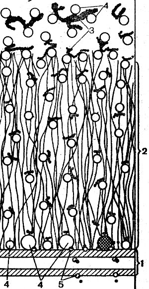 Рис. 15. Схема строения поверхности микроворсинки: 1 — протоплазматическая мембрана; 2 — гликокаликс; 3 — пищевые субстраты; 4 — ферменты; 5 — переносчики (Уголев, 75)