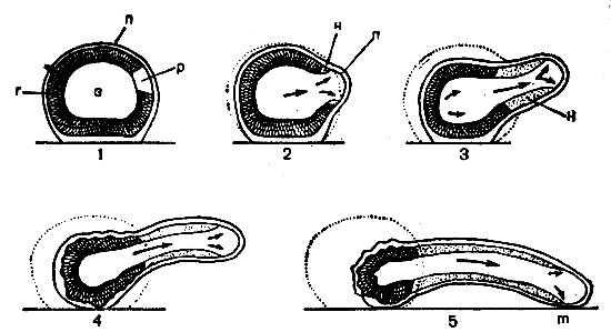 Амебоидное движение состоит в медленном перетекании тела клетки по субстрату и осуществляется благодаря внутриклеточному течению цитоплазмы и образованию временных псевдоподий (ложноножек). В наиболее простом случае образуется всего лишь одна Псевдоподия. Поверхностный слой клетки — эктоплазма (кортикальный или гиалиновый слой) — обладает высокой вязкостью и является, по-видимому, гелем. При образовании псевдоподий происходит превращение вязкого гиалинового слоя в легкотекучий золь, а более жидкая центральная часть протоплазмы (эндоплазма), существующая в форме белкового золя, перетекает в направлении движения в образующуюся псевдоподию. Эндоплазма в плазмодии слизевика образует одновременно несколько потоков, движущихся в разных направлениях.
