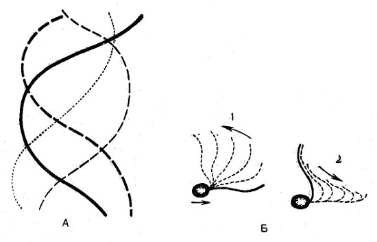 Движения ресничек и жгутиков по своему характеру очень разнообразны. Основной тип движения жгутиков — это ундулирующее, или волнообразное, движение. Как правило, форма волны является синусоидальной (рис. 42, А), и распространяется она в одном направлении, либо от основания жгутика к его вершине, либо наоборот. Большинство ресничек действует наподобие весел, производя гребущие взмахи. За эффективным напряженным ударом выпрямленной реснички (рис. 42, Б, 1) следует возврат расслабленной реснички в исходное положение (рис. 42, Б, 2). Частота взмахов может достигать 10—30 в 1 с, максимальная линейная скорость кончика реснички обычно не превышает нескольких десятков сантиметров в час. Интенсивность движения ресничек (жгутиков) зависит от температуры и концентрации водородных ионов.