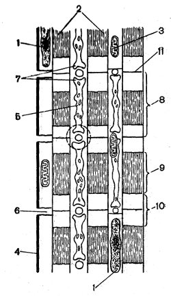 Рис. 45. Схема строения поперечнополосатого мышечного волокна лягушки: 1 — ядро; 2 — миофибриллы; 3 —. саркосома; 4 — сарколемма; 5 — саркоплазматический ретикулум; 6 — T-система; 7 — терминальные кристы; 8 — саркомер; 9 — А-диск, 10 — I-диск; 11— мембрана. Пунктиром обведена триада