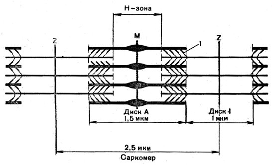 Рис. 46. Схема строения миофибриллы: 1 — поперечные мостики, М — М-мембрана, Z — Z-мембрана