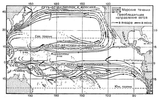 В конце 60-х годов XVI в. сложилась следующая система испанских морских связей в северной половине Тихого океана: из Мексики к Филиппинам корабли шли в полосе Северного Пассатного течения через остров Гуам, оставляя к югу Маршалловы острова, а от Филиппин к Акапулько возвращались по трассе Урданеты, описывая широкую дугу в сороковых широтах.