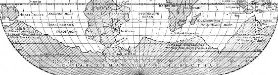 Неизвестная земля Птолемея — географическая нелепость. После путешествия Марко Поло в Европе отлично знали, что Земля синов — Южный Китай — нигде на юге не смыкается с птолемеевской Terra incognita, а после плавания Васко да Гамы стало ясно, что южная оконечность Африки омывается морем. В конце XV и в самом начале XVI в. в южном полушарии эта суша совершенно исчезла с карт. Ее нет ни на глобусе Мартина Бехайма (1492), ни на португальских картах того времени. Однако в XVI и XVII вв. птолемеевская перемычка, сорванная с окраины Азиатского и Африканского материков, появилась снова. Картографы эпохи великих открытий после 1515 г. создали в южном полушарии Неведомый Южный материк; опирались они при этом даже не столько на Птолемея, сколько на античных географов Помпония Мелу и Макробия. У Мелы и Макробия в соответствии с теориями единого Мирового океана и разделения Земли на поясы северной ойкумене — Азии, Европе и Африке — противопоставлялась примерно равная ей по площади южная, пока еще неведомая суша. У Мелы она называлась Землей антихтонов (противоживущих), у Макробия — Землей антиподов. Сравнительно узкая полоса моря разделяла эти два массива земной суши. У Макробия материки-антиподы, равновеликие друг другу, подразделены были на симметричные зоны: жаркую, холодную и умеренную.