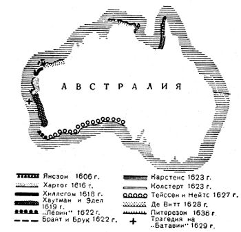 Таким образом, с 1606 по 1636 г. голландские мореплаватели открыли почти все западное побережье Австралии, часть ее южного берега от мыса Луин до 133° в.д. и довольно значительные участки северного берега (западное побережье полуострова Кейп-Йорк и северное побережье полуострова Арнхемленд). На северном побережье Австралии остались, однако, два «белых пятна»: «зазор» между полуостровами Кейп-Йорк и Арнхемленд, образованный еще не обследованным заливом Карпентария (голландцы лишь предполагали что это залив, так как им неизвестны были его южные берега), и северо-западное побережье между 20° ю.ш. и северо-западной частью Арнхемленда. Вся же внутренняя территория Австралии была сплошным «белым пятном», которое захватывало юго-западную часть Тихого океана, сливаясь с Южной Землей Святого духа, положенной на карты Киросом.