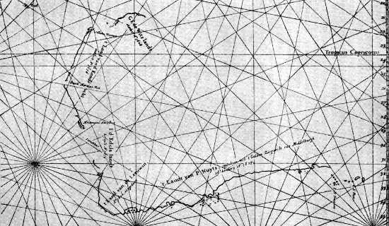 Голландские открытия на западных и южных берегах Австралии. Фрагмент карты 1628 г. Хесселя Геретса. Из книги A. Sharp «Discovery of Australia»