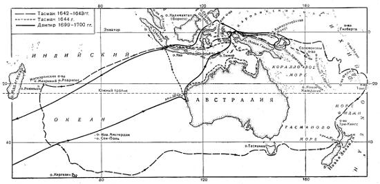Маршруты Тасмана и Дампира. Из «Атласа истории географических открытий и исследований». 1959 г.. Увеличить (в отдельном окне)