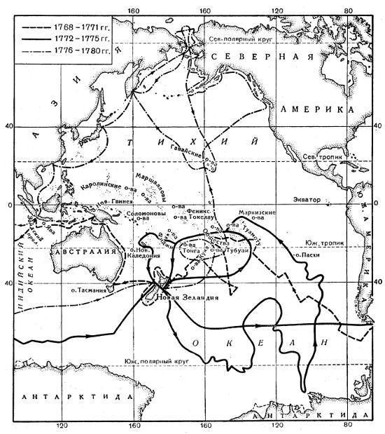 Маршруты первого, второго и третьего плаваний Джемса Кука