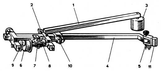 Прибор имеет два рычага и счетный механизм (рис. 12). Полюсный рычаг 1 соединен шарниром 2 с обводным рычагом 4, а его другой конец опирается на неподвижный полюс 3 — тяжелый цилиндр, снабженный иглой, которая при работе крепит бумагу к столу и обеспечивает неподвижность полюса. Обводный рычаг 4 на одном конце имеет шпиль 5 для обвода измеряемого контура фигуры, а близ другого его конца закреплен счетный механизм. Колесико 6 при движении шпиля катится или скользит по бумаге, его движения передаются червячной передачей 7 на циферблат 8.