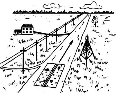 По линиям местности карту ориентируют, например, в случае, когда точка стояния находится на линейном объекте (на дороге, под линией связи, у контура леса и т. п.) и ее положение хотя бы приблизительно известно. Карту повертывают так, чтобы линейный знак объекта на карте совпал с его направлением в натуре, а предметы, находящиеся по его сторонам, располагались в соответствующих местах на карте (рис. 46).