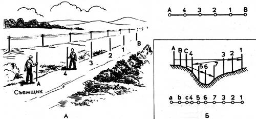 Рис. 58. Последовательность установки вешек при провешивании линий: А — на ровном участке, Б — через балку