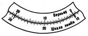 Полный отсчет по лимбу А складывается из отсчета А1, по основному кругу от 0 лимба до 0 верньера и отсчета по верньеру: A = A1 + a.