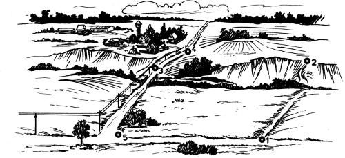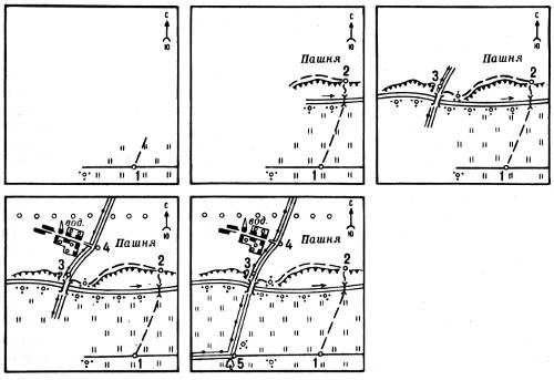 Наносимые на планшет объекты показывают условными знаками; если они занимают большие площади, то внутри контура дают их словесные характеристики (пашня; кустарник лиственный, высотой 2 м и т. п.). На рисунках 100, 101 представлена снимаемая местность и показан вид планшета последовательно на пяти точках съемочного хода.
