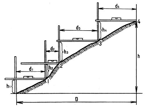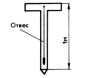 Инструментами для ватерпасовки служат две легкие рейки длиной около 2 м с сантиметровыми делениями и ватерпас — накладной уровень. Принцип ватерпасовки представлен на рисунке 111. Одна рейка устанавливается вертикально, другая, имитирующая визирный луч нивелира,— горизонтально (что контролируется ватерпасом). Отрезок вертикальной рейки (установленной нулем вниз) от земли до горизонтальной рейки определяет превышение h двух соседних точек, а длина, отсчитанная по горизонтальной рейке от земли до вертикальной,— заложение d. Сумма всех превышений дает относительную высоту первой и конечной точек, а сумма всех заложений — горизонтальную проекцию склона. Запись отсчетов по рейкам удобно вести в виде ступенчатого абриса (рис. 111), где указываются превышения (по вертикали) и заложения (по горизонтали) в сантиметрах. По нему в камеральных условиях легко построить профиль. Скрепленные вместе вертикальная планка длиной в 1 м с отвесом и горизонтальная планка более короткая представляют собой школьный нивелир (рис. 112).
