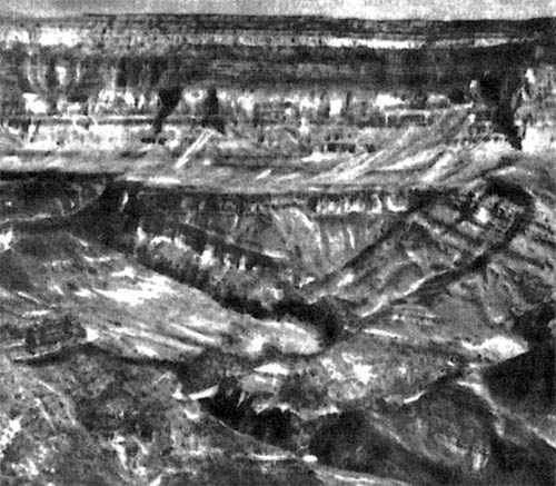 Фото 3. Слои осадочных пород, выходящие в стенке Большого каньона вблизи устья Шинумо-Крик (вид на северо-запад, вниз по течению), Расстояние по вертикали от края обрыва до русла реки Колорадо (на переднем плане) около 1600 метров.
