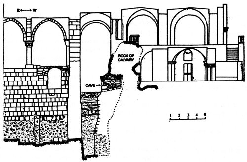 Храм Гроба Господня в Иерусалиме. Разрез запад-восток через участок со скалой Голгофы, вид с юга. (ACR)