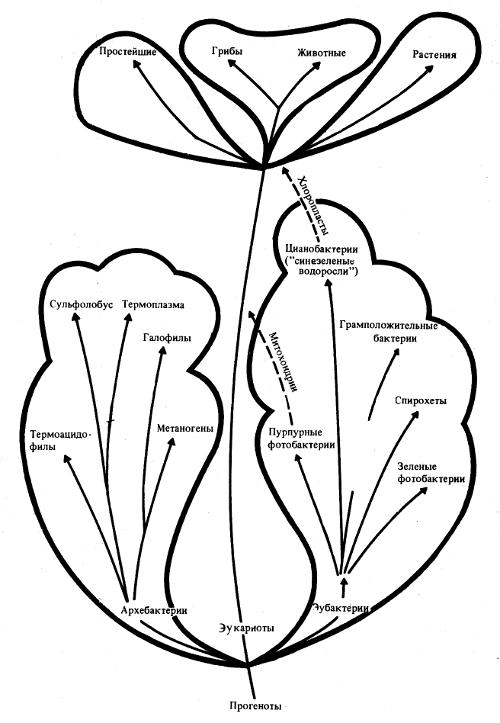 Возникнув в водной среде в виде дискретных, способных к самовоспроизведению систем, живые организмы прошли в земных условиях гигантский эволюционный путь. Около двух миллиардов лет потребовалось с момента возникновения жизни для эволюционной отработки ее основ. Шло совершенствование нуклеопротеиновых комплексов, аппарата белкового синтеза, матричных процессов организации генома. Два миллиарда лет назад в атмосфере Земли появился в заметных количествах свободный кислород как результат жизнедеятельности фотосинтезирующих бактерий. Еще через полмиллиарда лет сформировались эукариотические клетки. Примерно миллиард лет назад возникли многоклеточные растения и животные. Потребовалось еще 500—600 млн. лет для выхода на сушу первых растений и животных. На границе палеозоя и мезозоя 200 с лишним миллионов лет назад, среди примитивных рептилий обособились хищные терапсиды, давшие начало млекопитающим. Первые приматы появились в меловой период, 70 с лишним миллионов лет назад, еще во времена господства динозавров. Эволюция семейства Hominidae продолжалась на протяжении последних 6 млн. лет. Примерно 1,5 млн. лет назад сформировался первый настоящий человек Homo erectus, тогда как первые представители Homo sapiens появились всего лишь 100 тыс. лет назад. На рис. 1.1 представлена геохронологическая схема и отражены главные события в эволюции органического мира. На рис. 1.2 дана схема взаимоотношений основных царств живых организмов.