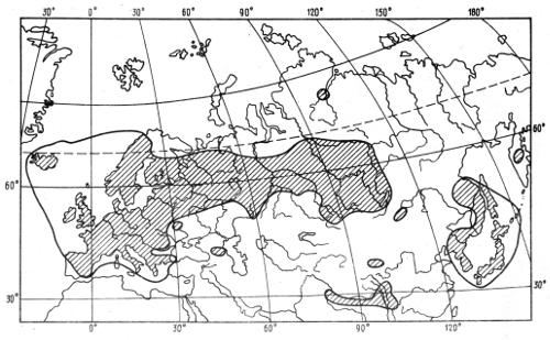 Рис. 2.3. Распространение кислички Oxalis acetosella в пределах Евразии (заштриховано) (по А.И. Толмачеву, 1974)