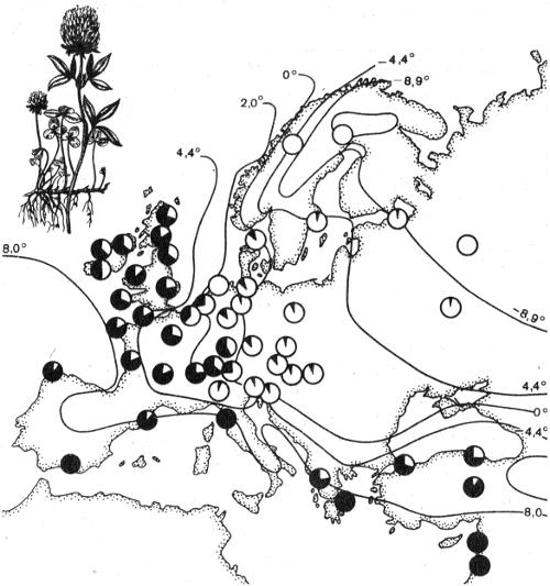 Рис. 2.7. Клинальная изменчивость содержания цианидов в белом клевере Trifolium repens, сопряженная со средней температурой января (по А.В. Яблокову, 1987): цифрами обозначены изотермы, черным сектором в кружках — доля цианидов
