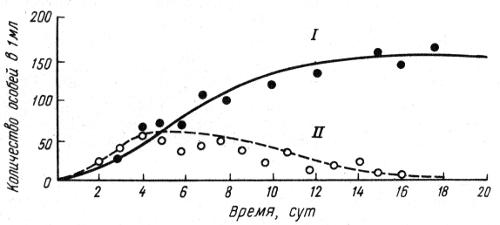 Рис. 2.12. Динамика конкурентных отношений двух видов инфузорий — Paramecium aurelia (I) и P. caudatum (II) в экспериментальной культуре (по Г.Ф. Гаузе, 1934)