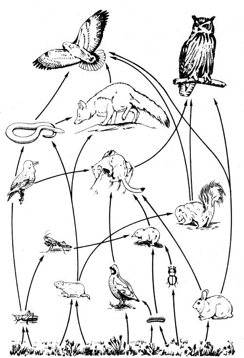 Рис. 2.8. Пищевые связи в упрощенной трофической системе (по Р. Риклефсу, 1979)