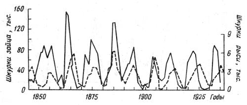 Рис. 2.9. Связь колебаний численности американского зайца-беляка Lepus americanus и канадской рыси Lynx canadensis (по D. MacLulich, 1937): сплошной лившей обозначены колебания численности популяции зайца-беляка, прерывистой — популяции рыси