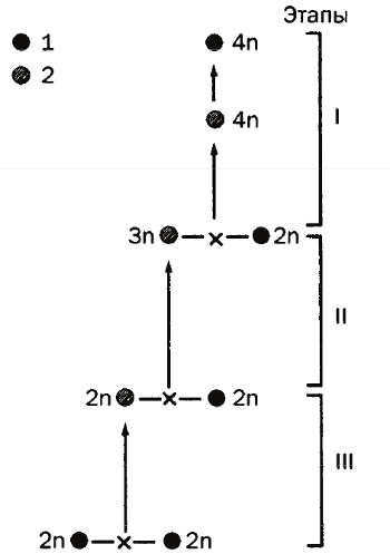 На первом этапе в результате гибридизации на уровне бисексуальных нарождающихся диплоидных видов может образоваться диплоидная форма, переходящая к клональному размножению путем гиногенеза (рыбы), «одалживания» отцовского генома на одно поколение (рыбы, бесхвостые амфибии) или партеногенеза (хвостатые амфибии, рептилии). На втором этапе вследствие возвратной гибридизации этой диплоидной однополой формы с одним из родительских видов может возникнуть триплоидная однополая форма, размножающая с помощью гино- или партеногенеза. Наконец, на третьем этапе в результате скрещивания этой последней с одним из близких бисексуальных диплоидных видов может появиться тетраплоидная форма, способная вернуться к нормальному бисексуальному размножению (рис. 11).