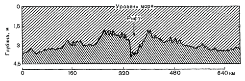 Рис. 21. Широтный профиль дна средней части Атлантического океана. Виден рифт (в данном месте глубиной около 1800 метров), по которому происходит поднятие базальтовых лав.