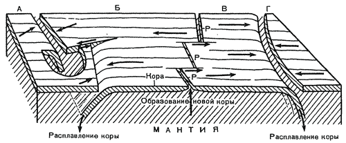 Рис. 26. Схема, показывающая образование и разрушение земной коры и столкновения плит коры. Видны участки четырех плит (А, Б, В, Г); стрелками показано направление их движения. Океанический рифт (Р) осложнен разломами. В краевой части плиты А на модели прорезано отверстие, через которое видно, что в передней части плита Б погружается под плиту А, а в задней части соотношение обратное. В другом случае столкновения плита В погружается под плиту Г.