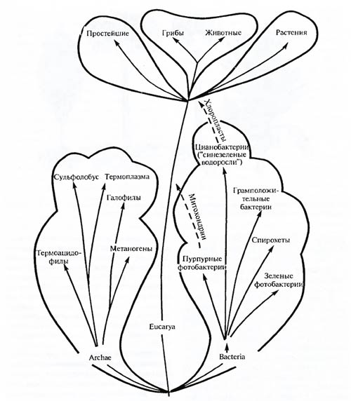 Большинство исследователей признают, что вскоре после возникновения жизни она разделилась на три корня, которые можно назвать надцарствами. По-видимому, больше всего черт исходных протоорганизмов сохранили архебактерии, которых прежде объединяли с настоящими бактериями – эубактериями. Архебактерии обитают в бескислородных илах, концентрированных растворах солей, горячих вулканических источниках. Второе мощное надцарство – эубактерии. Из третьего корня развилась ветвь организмов, имеющих оформленное ядро с оболочкой,– эукариоты. Есть обоснованная гипотеза (разделяемая все большим числом ученых), что эукариоты возникли в результате симбиоза их предков с предками митохондрий и хлоропластин – аэробных бактерий и цианобактерий (рис. 5.3). Эта гипотеза даст удовлетворительное объяснение многим чертам сходства в строении и биохимических особенностях органелл – внутриклеточных источников энергии эукариот,– с таковыми свободноживущих прокариот. Колоссальное значение для развития биосферы в целом имело возникновение и распространение одной из групп эубактерий – цианобактерий. Они способны осуществлять оксигенный фотосинтез, и в результате их жизнедеятельности в атмосфере Земли должен был появиться кислород в достаточно больших количествах. Появление кислорода в атмосфере определило возможность последующего развития растений и животных.