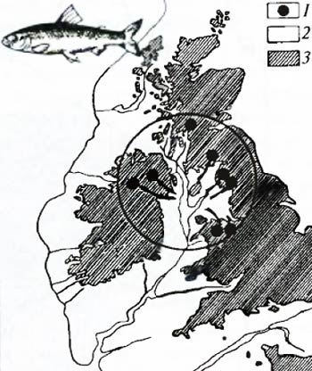 Рис. 6.10. Современное распространение пресноводных сигов рода Coregonus на Британских островах (по И.А. Бобринскому и др., 1946): 1 – распространение современных видов; 2 – бывшая территория суши; 3 – современная суша
