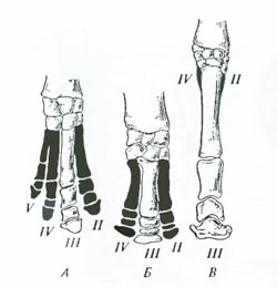 Рис. 6.20. Сравнительно-анатомический ряд: А – передние конечности тапира (Tapirus), Б – носорога (Ceratotherium); В – лошади (Equus); II–V– пальцы (из Д.К. Беляева и др., 1967)
