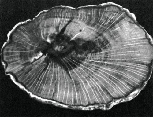 Фото 14. Окаменелое дерево. Срез небольшого ствола. Клеточная структура сохранилась вследствие заполнения клеток кремнеземом.