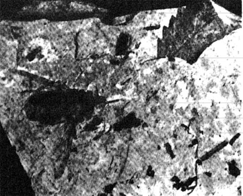 Фото 36. Ископаемая Glossina (муха це-це) из озерных олигоценовых отложений. Рядом с ней - ископаемый лист дерева, родственного современным березам.