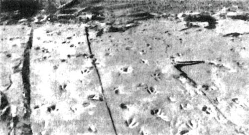 Фото 17. Цепочки следов, в большинстве длиной 25-45 см, оставленных динозаврами на поверхности напластования триасовых песчаников. Государственный заповедник динозавров, Коннектикут. Более 200 миллионов лет назад этот песчаник был песчаным аллювием. Стрелками указаны гораздо более мелкие следы, возможно, принадлежащие животному, изображенному на рис. 47.