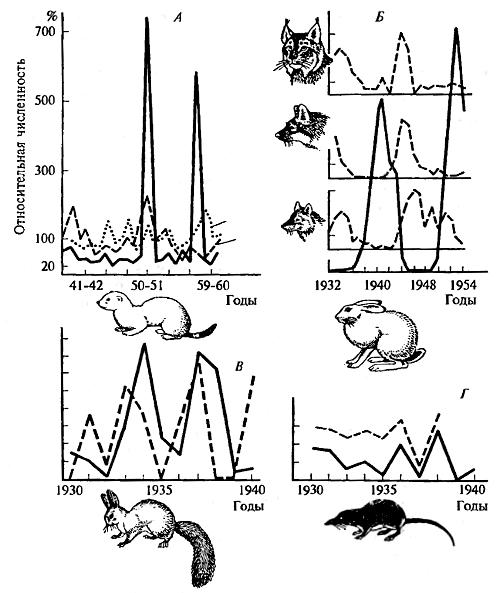 Рис. 7.1. Характер колебаний численности особей в популяциях некоторых млекопитающих: А — горностая (Mustela erminea) в трех популяциях Якутии; Б — рыси (Felis lynx), лисицы (Vulpes vulpes), волка (Canis lupus) и зайца-беляка (Lepus timidus) в группе популяций Севера европейской части России; В — белки (Sciurus vulgaris) в Костромской области (пунктиром — урожай семян ели); Г — обыкновенной землеройки (Sorex araneus) (пунктиром — высота весенних паводков) (по данным разных авторов из Н.В. Тимофеева-Ресовского и др., 1973)