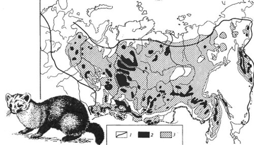 Рис. 9.5. Пространственная структура ареала соболя (Martes zibellina) (по А.А. Насимовичу и В.В. Тимофееву, 1973): 1 — границы ареала; 2 — оставшиеся в 30-е годы популяционные островки населения; 3 — территория, занимаемая соболем в 80-е годы XX