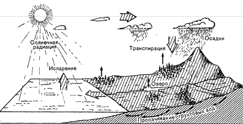 Эта система, рассматриваемая в более широком плане, представляет собой часть круговорота воды (рис. 4). В таком круговороте часть осадков просачивается в землю, поглощается корнями растений, поднимается к листьям и с их поверхности испаряется в атмосферу, из которой выпадает затем в виде дождя. Но часть воды остается в растениях. В процессе фотосинтеза она соединяется с углекислым газом, который проникает в растение из атмосферы через поры листьев, и образует питательные вещества и ткани растения.