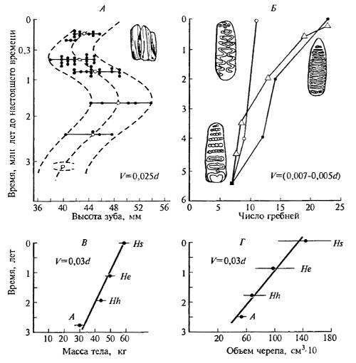 Рис. 16.4. Темпы эволюции некоторых органов и структур: А — величина коренного зуба зубров рода Bison; Б — число гребней коренного зуба в трех линиях слонов: индийского Elephas maximus (точки), африканского Loxodonta africana (кружки) и мамонта Mammuthus primigenius (треугольники); в — средняя масса тела в роде Homo; Г — объем мозговой коробки в роде Homo (A — Australopithecus. Hh — Н. habilis. He — Н. erectus, Hs — Н. sapiens) (по данным разных авторов)