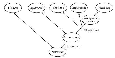 Рис. 18.1. Возможная схема филогенеза человекообразных форм (по данным разных авторов)