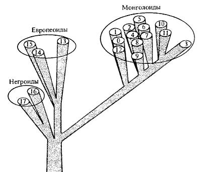 Рис. 18.8. Схема взаимоотношения современных рас человека (по Я.Я. Рогинскому и М.Г. Левину, 1978)