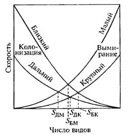 Рис. 19.4. Модель взаимодействия изоляции и площади местообитания, показывающая возможность существования нескольких равновесных состояний в процессе проникновения новых видов и темпа вымирания аборигенных форм. Равновесное число видов при прочих равных условиях будет меньше на удаленных островах, на более мелких островах и на островах с менее разнообразными биотопами, SДМ, SБМ, SДК, SБК — точки равновесия (по Р. МакАртуру и Е.О. Вильсону, 1967)