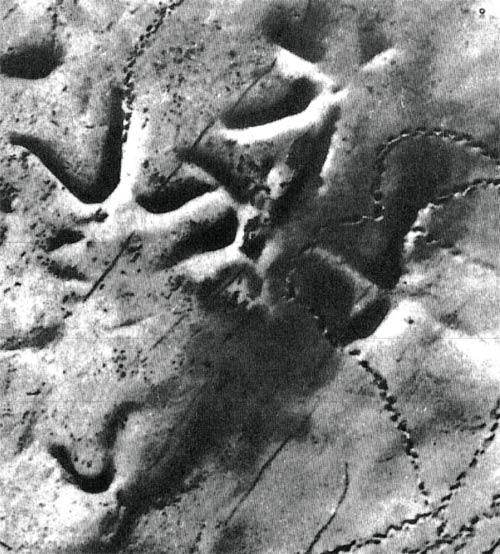Другим способом, используя рога, защищался трицератопс и его многочисленные родственники (фото 44). Эти громоздкие короткохвостые четвероногие достигали 7,5 метра в длину и трех метров в высоту. Их наиболее характерной особенностью был огромный тяжелый череп, который протягивался назад в виде большого щита, защищавшего шею. Спереди череп был снабжен двумя рогами, выступавшими над узким клювом, похожим на клюв попугая. Внутри черепа находился мозг, небольшой, по нашему мнению, но достаточно крупный для динозавра. Наличие такого мозга позволяет предположить, что эти животные, обладавшие защитным шлемом и рогами, были довольно подвижны. Об этом свидетельствует незащищенность задней части их тела, не имевшей ни брони, ни какого-либо оружия. Совершенно ясно, что они могли быстро поворачиваться, чтобы отразить нападение врага рогами. Следами таких древних битв являются, возможно, шрамы, часто встречающиеся на ископаемых остатках шейной брони.