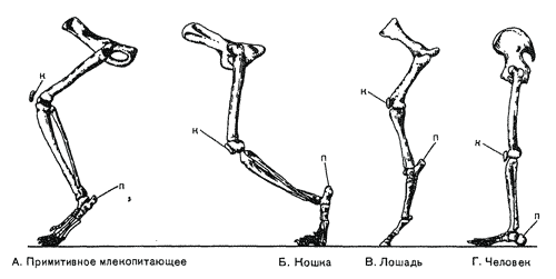 Эволюция конечностей и зубов. Ископаемые скелеты, собранные в различных отложениях мезозоя, обнаруживают прогрессирующие изменения в строении, очевидно связанные со средой обитания и с тем способом питания, который был обусловлен этой средой. Млекопитающие, которые паслись в лесах и редколесьях, сохраняли примитивную, довольно плоскую стопу, которая, как мы предполагаем, была типична для мезозойских млекопитающих. У них сохранялись также неспециализированное коренные зубы, служившие для пережевывания лиственной пищи. Постепенно ноги их удлинялись, что отчасти позволяло им лучше спасаться от хищников, которые постепенно становились более опасными.