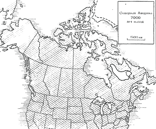 Рис. 63. Схема таяния ледников Северной Америки в конце последней ледниковой эпохи (главным образом по данным Геологической службы Канады). Г. Около 7000 лет назад.