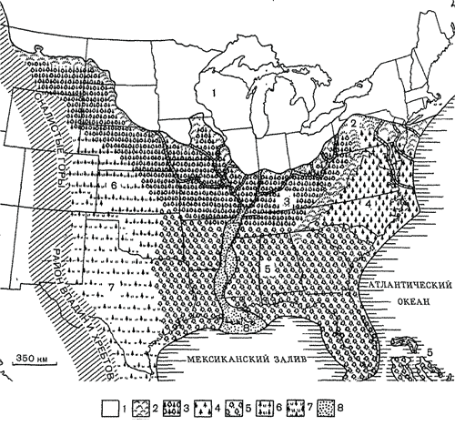 Рис. 66. Облик территории Соединенных Штатов и южной Канады 20 000-15 000 лет назад. Границы между растительными зонами показаны приближенно, особенно на юге и юго-западе. 1 - ледниковый покров; 2 - тундра с редкими еловыми деревьями; безлесные пространства; 3 - лес, преимущественно еловый на севере, с небольшой примесью ели на юге; 4 - еловый лес с примесью сосны; количество сосны возрастает к югу; 5 - смешанный лес с широколиственными породами деревьев; 6 - сосновое редколесье с травянистой растительностью; 7 - травянистые пространства с очень редкими сосновыми деревьями; 8 - днища долин, сложенные песчано-галечными отложениями, принесенными ледником (растительность не показана),