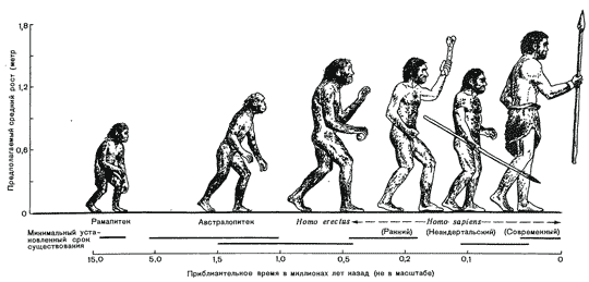 Рис. 76. Время существования (жирные линии), средняя высота и предполагаемый облик шести видов гоминид