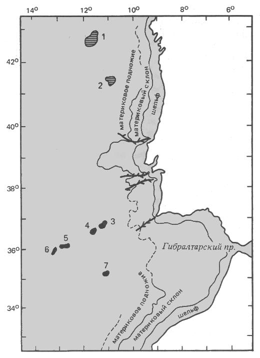 Рис. 15. Морфология материковой окраины к западу от Гибралтарского пролива. 1 – банка Галисия, 2 – банка Виго, 3 – подводная гора Ормонд, 4 – банка Геттисберг, 5 и 6 – подводный архипелаг Подковы, 7 – Коралловая банка. Прилегающая к Португалии часть материкового склона изрезана многочисленными подводными каньонами. (Составлено по данным X. Монтейры, 1971)