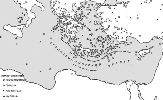Рис. 23. Схема землетрясений в Восточном Средиземноморье. Условными знаками обозначены эпицентры землетрясений, которые произошли в 1961–1967 годах, с учетом глубин их очагов. В Эгейском бассейне землетрясения особенно часты, но преимущественно неглубоки. Наоборот, вокруг Сицилии преобладают глубинные землетрясения. По данным глубин очагов землетрясений была реконструирована тектоническая карта Средиземноморья (она изображена на рис. 21). В Эгейском бассейне мы видим дугу характерных для этого района молодых вулканов. (По Д. Стэнли, 1972)