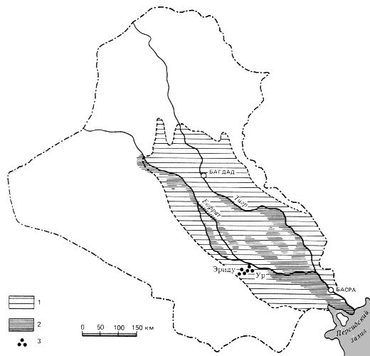 Рис. 41. Затопляемые районы Месопотамии на территории современного Ирака. 1 – аллювиальная равнина, то есть территория, в прошлом либо настоящем затопляемая водами Евфрата и Тигра; 2 – территория, затопленная во время крупного весеннего наводнения 1954 года, 3 – развалины древних городов